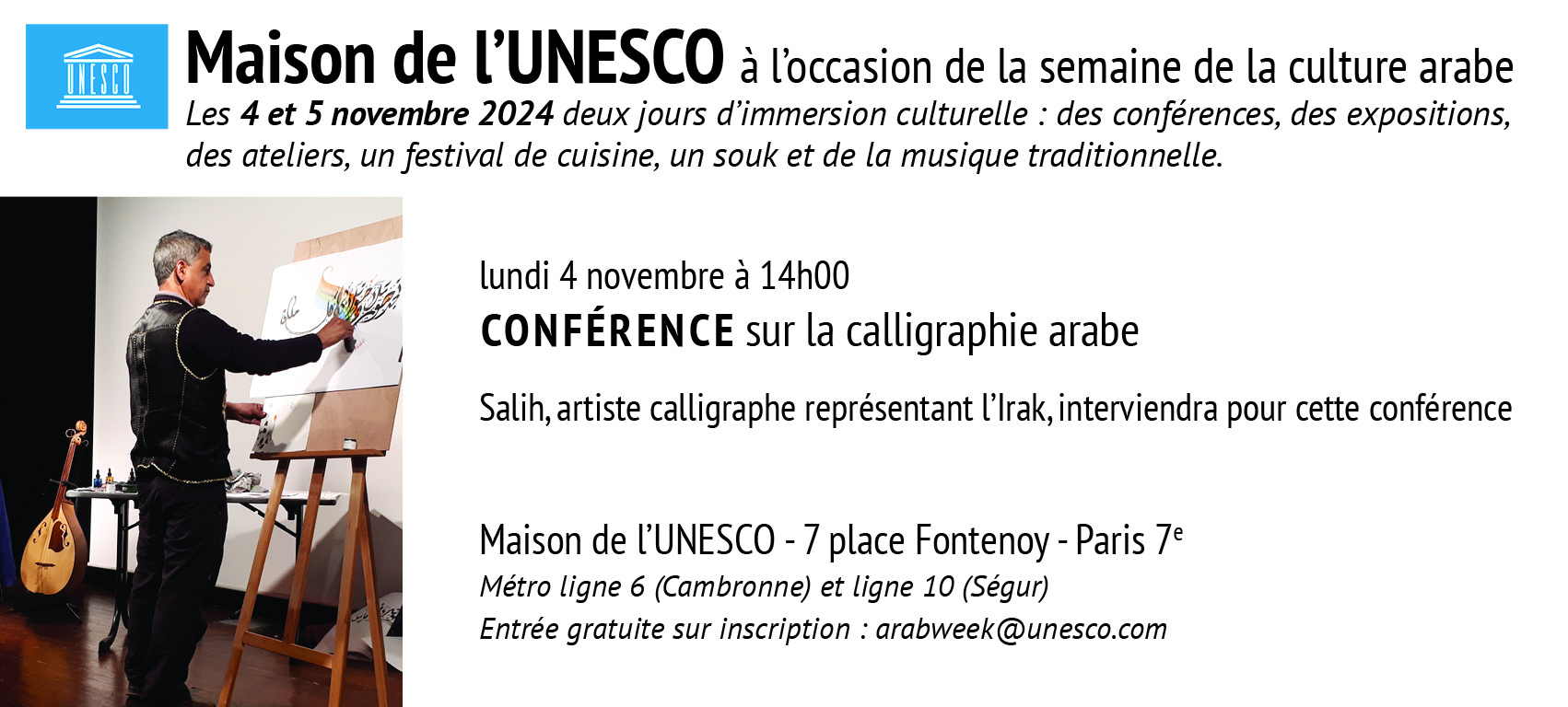 Intervenant pour la Conférence sur la calligraphie arabe qui se tiendra lundi 4 novembre de 14h00 à 15h00 à l’occasion de la semaine de la Culture Arabe